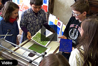 Enfin, Mme Weinling nous a montré des tampons réalisés par Jean-Louis Boncœur. Nous les avons utilisés, avec de l'encre, pour reproduire le dessin de l'artiste sur notre petit livre. (Loïc et Jérémy)